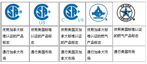 您将会看到下列 CSA 标志及标签出现在广泛的产品上,包括电气、燃气、个人防护设备及机械产品。 c表示 加拿大,us表示美国。举例 cCSA表示可进入加拿大市场, CSAus表示可进入美国市场,cCSAus表示可进入美国和加拿大市场。